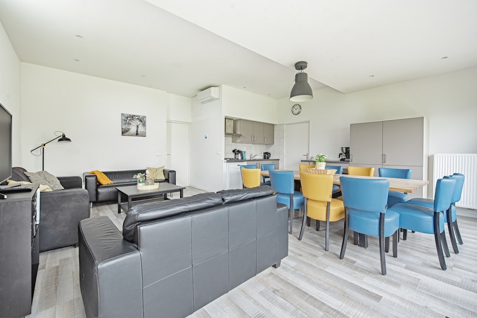 Deze geschakelde, gelijkvloerse bungalow is geschikt voor maximaal 12 personen. Via de hal bereik je de woonkamer. Deze is ingericht met een gezellige zithoek met smart-tv en dvd-speler. In de woonkamer is airconditioning aanwezig, zodat je op warme dagen een heerlijk koele kamer hebt. De open keuken is voorzien van onder andere een filter koffiezetapparaat, een koffiepadapparaat, een waterkoker, een koelkast met vriesvak, een (combi)magnetron, een oven en een vaatwasser.