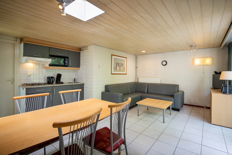 Indeling: woonkamer met flatscreen tv en dvd-speler, open keuken met magnetron, koelkast met vriesvak en koffiepadmachine en koffiefiltermachine. Badkamer met ligbad of douche, wastafel en toilet. Eén slaapkamer met twee eenpersoonsbedden. Terras met verstelbaar tuinmeubilair en kussens. De bungalow is huisdiervrij.