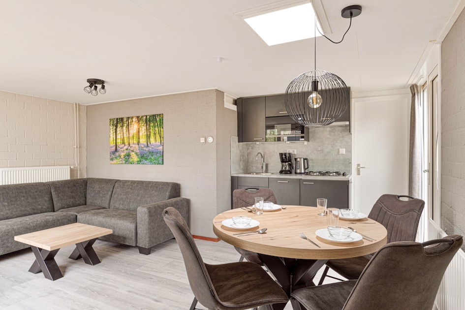 Deze gelijkvloerse bungalow voor 4 personen heeft een woonkamer met televisie. In de keuken vind je onder andere een vaatwasser, magnetron en filter koffiezetapparaat. Er is 1 slaapkamer met 2 eenpersoonsbedden en 1 slaapkamer met een stapelbed.