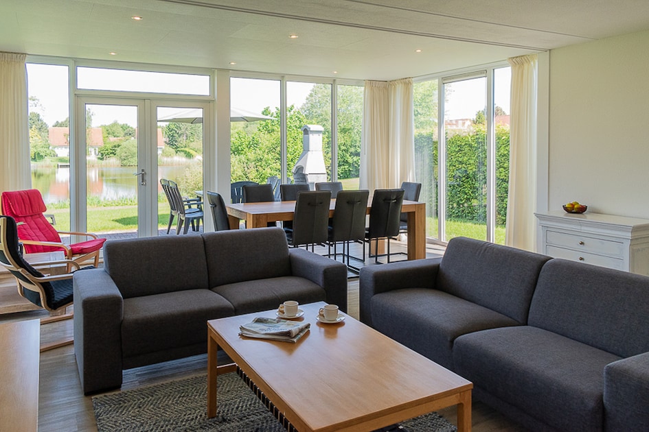 Deze bungalow voor 8 personen heeft een ruime woonkamer met zithoek, een smart-tv en een eethoek. De keuken is volledig ingericht met onder andere een koffiezetapparaat, een koelkast en een vaatwasser. Deze bungalow heeft 1 badkamer met douche en ligbad beneden en 3 slaapkamers boven. 1 Slaapkamer is voorzien van twee bedden, de overige slaapkamers zijn elk ingericht met drie bedden. De bungalow beschikt over een apart toilet.