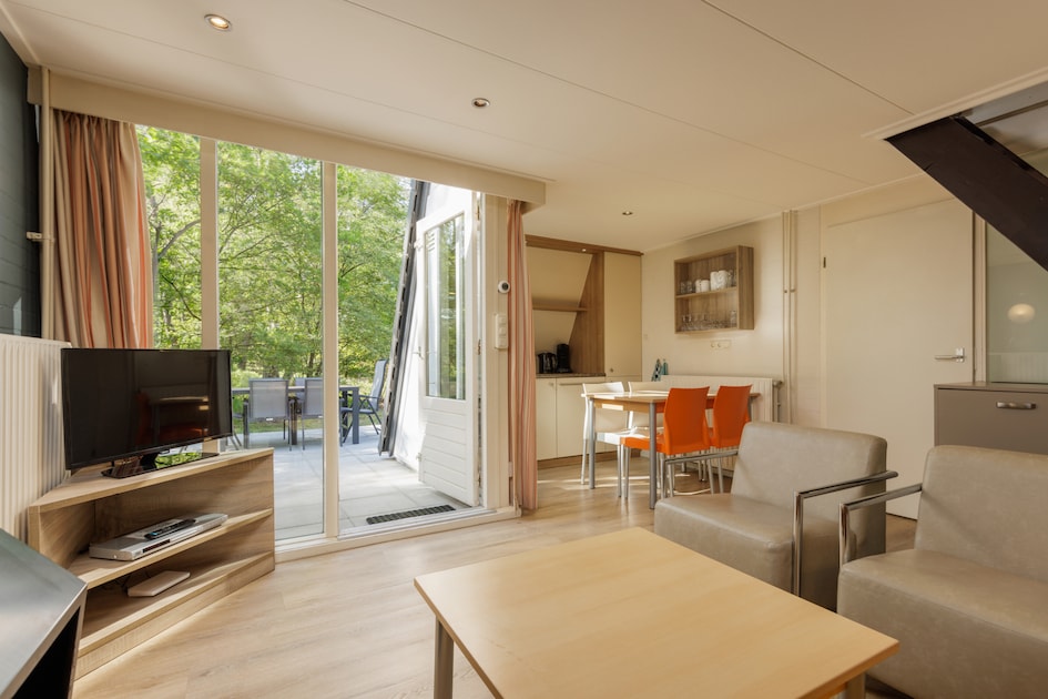Deze vrijstaande bungalow voor 4 personen heeft een woonkamer met zithoek en televisie. In de open keuken vind je onder andere een vaatwasser, koelkast met vriesvak, combimagnetron en zowel een koffiepad- als filterkoffiezetapparaat. Op de eerste verdieping zijn 2 slaapkamers met elk 2 eenpersoonsbedden. Ook is er ruimte voor een campingbedje. De badkamer bevindt zich op de begane grond en beschikt over een inloopdouche en toilet. Daarnaast is er een infraroodsauna aanwezig. De bungalow heeft een terras met tuinmeubilair. Parkeren kan op de centrale parkeerplaats.