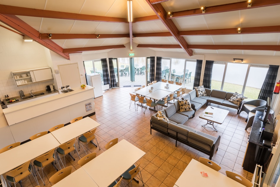 Deze vrijstaande, gelijkvloerse woning is geschikt voor maar liefst 40 personen en ook goed toegankelijk voor mindervaliden. De gemeenschappelijke recreatieruimte beschikt over een zithoek met televisie, dvd-speler en HiFi-set, en een eethoek. Er is een ruime keuken met een vaatwasser, koelkast, oven, magnetron en koffiezetapparaat.