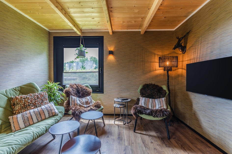 Deze vrijstaande lodge is geschikt voor 4 personen. In de woonkamer is een zithoek met een smart-tv. Er is vloerverwarming. De keuken heeft een vaatwasser, koelkast met vriesvak, oven, koffiecupmachine en een kokendwaterkraan. In totaal zijn er 2 slaapkamers, 1 boven en 1 beneden. Op 1 van de slaapkamers is ruimte voor 1 campingbedje voor een baby of peuter. Ook zijn er 2 badkamers, beide met inloopdouche en toilet. Buiten is er een terras met tuinmeubilar. Je kunt gratis gebruik maken van wifi.