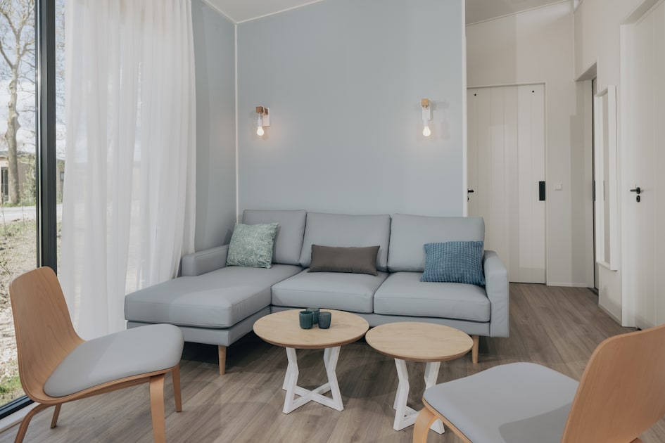 Deze vrijstaande, gelijkvloerse lodge voor 6 personen heeft een woonkamer met zithoek, een smart-tv en een eethoek. De open keuken is volledig ingericht met onder andere een koffiepadapparaat en een waterkoker. Er zijn 3 slaapkamers waarvan 2 slaapkamers met 2 eenpersoonsbedden en 1 slaapkamer met een stapelbed. 1 van de slaapkamers beschikt over een badkamer en suite met douche en toilet. De andere badkamer heeft ook een douche en er is een apart toilet. De lodge heeft verder een overdekt terras dat je kunt betreden via de openslaande tuindeuren. Je kunt er gebruik maken van het comfortabele tuinmeubilair. Parkeren kan op de centrale parkeergelegenheid.