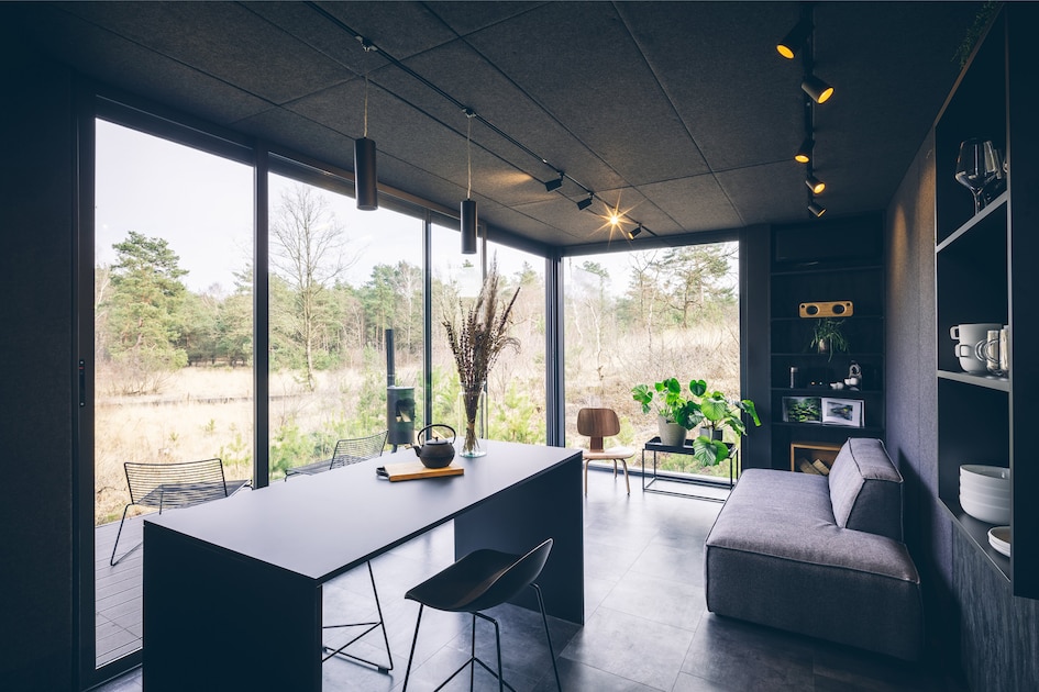 Deze vrijstaande Outdoor Suite Hottub is geschikt voor 2 volwassenen. Via een kleine trap bereik je de voordeur, die opengaat met de Cuber app. Vanuit de zithoek in de woonkamer kijk je vervolgens uit op de natuur. Geniet van rijk, kamervullend geluid met de Sonos One SL en speel je favoriete muziek af met de Sonos-app, AirPlay 2 en meer. De open keuken beschikt over onder andere een vaatwasser, combimagnetron en een koffiecupapparaat. Via de badkamer met een toilet en een inloopregendouche met glazen plafond, bereik je de slaapkamer. Hier staat een tweepersoons kingsizebed. Onder het bed zit een lade, om je koffer uit het zicht op te bergen.