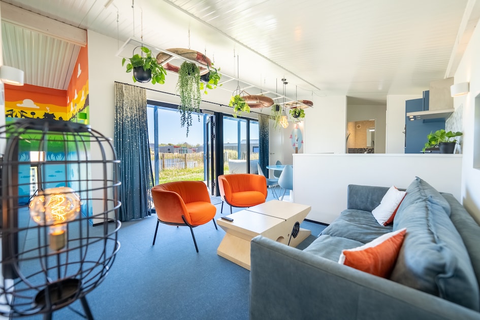Callantsoog ligt direct achter de duinen, die een belangrijk onderdeel van de Nederlandse kustverdediging zijn. Water zal altijd een belangrijke rol spelen en deze unieke lodge is in dat thema ingericht. Niet alleen de kleur blauw, maar ook bijzondere illustraties op de muren maken deel uit van dit thema. De speelhoek voor kinderen is een heus indoor vlot waar je via een trappetje op klimt. En vergeet de unieke designmeubels niet!