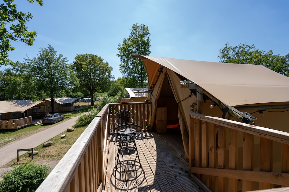 Deze unieke safaritent heeft een verdieping en is geschikt voor maximaal 2 volwassenen. De keuken bevindt zich beneden en is uitgerust met een 2-pits fornuis, een koelkast, koffiepadapparaat en een waterkoker. De slaapkamer is via een vaste buitentrap bereikbaar en beschikt over 1 tweepersoonsbed. De badkamer met wastafel, douchecabine en toilet bevindt zich beneden. De tent heeft beneden een ruime veranda en boven een dakterras, beide voorzien van tuinmeubilair. De televisie beschikt over streamfuncties. Dit maakt het mogelijk om apps van je telefoon of tablet direct op het scherm van de televisie te bekijken. Je maakt hierbij gebruik van je eigen accounts. Je maakt gratis gebruik van wifi.