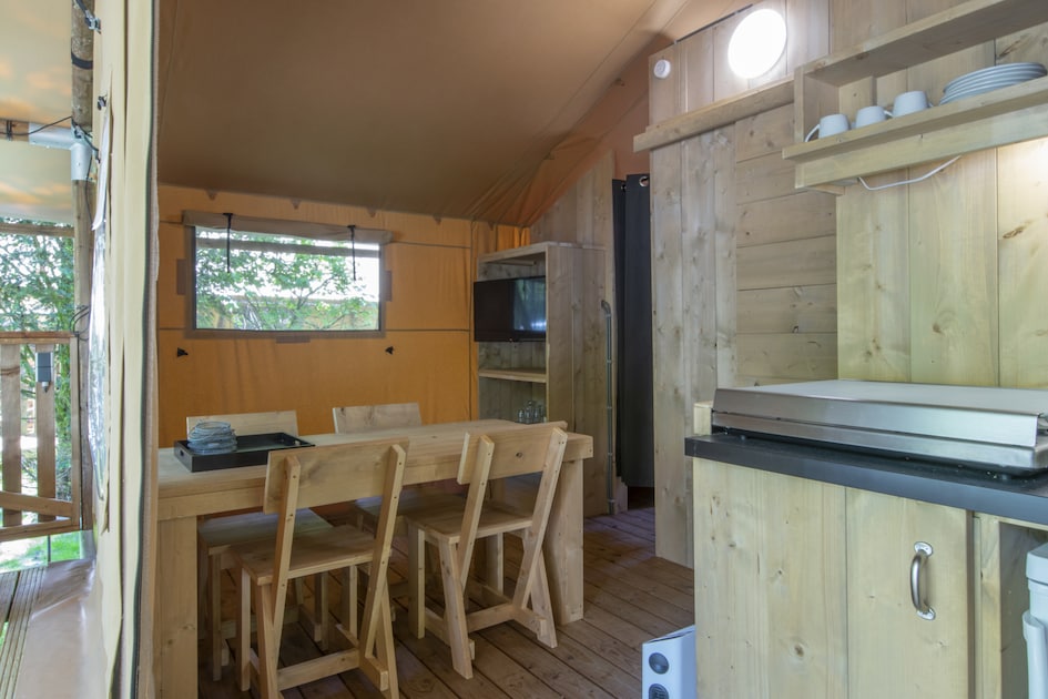 De safaritent is geschikt voor maximaal 4 personen. De open keuken is voorzien van o.a. koelkast, waterkoker, gasfornuis en koffiezetapparaat. De woonkamer beschikt over een televisie en elektrische kachel. Er is een volledig ingerichte badkamer met toilet en douche aanwezig. In de slaapcabines vind je één tweepersoonsbed en één stapelbed. Je kunt gratis gebruikmaken van wifi en er is ruimte voor 1 auto naast het verblijf. Er is 16 ampère aanwezig.