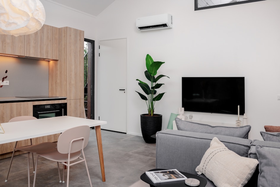 Deze villa met airconditioning is geschikt voor 2 personen. De woonkamer met vloerverwarming beschikt over een televisie waarop je kan streamen. Ook is er een soundbar, waarop je al je favoriete muziek kan luisteren. In de keuken vind je een koel-vriescombinatie, een koffiecupapparaat geschikt voor Iperespresso-capsules van illy, een combimagnetron, een kokend waterkraan, een thermostaatkraan, een oven en een vaatwasser. De villa heeft een slaapkamer met 1 extra lang tweepersoonsbed van 210 cm. Via de slaapkamer beland je zo in de badkamer met vloerverwarming. Hier vind je een inloopregendouche, een föhn en zelfs een traditionele sauna. Ook is er een apart toilet.
