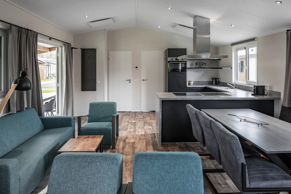 De gemeenschappelijke ruimte is geschikt voor 12 personen en staat los van de hotelchalets. In de ruime woonkamer vind je een zithoek met televisie en twee zespersoons eettafels. Aangrenzend de open keuken, deze is voorzien van een standaard keukeninventaris voor 12 personen. Daarnaast is er onder andere een vaatwasser, koelkast met vriezer, combimagnetron en koffiecupapparaat. Via de openslaande deuren bereik je het overdekte terras met 12-persoons tuinmeubilair. Deze gemeenschappelijke leefruimte beschikt verder over een berging, 1 toilet en airconditioning. Het gebruik van wifi is gratis.